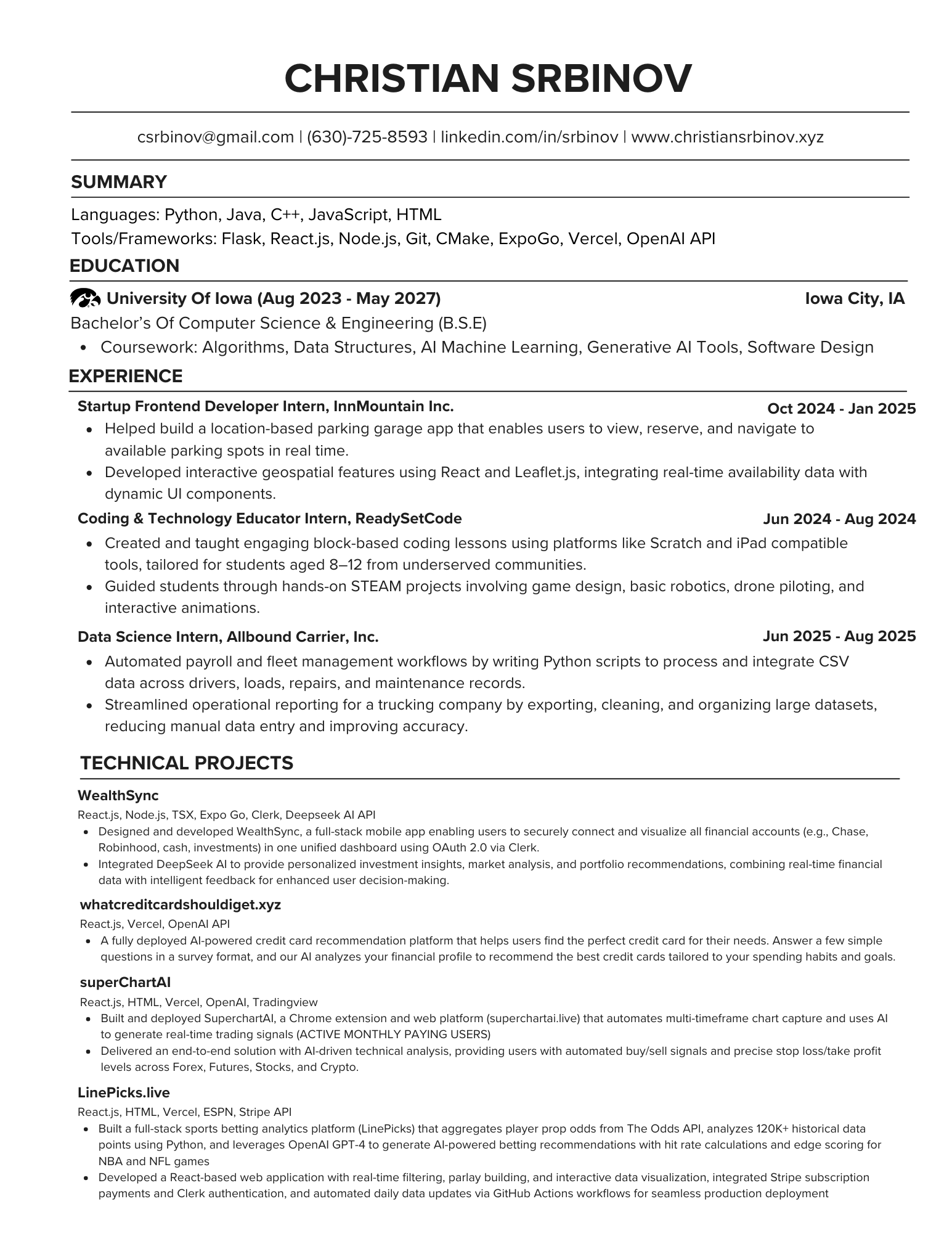 I'm a Computer Science & Engineering student at the University of Iowa with a growing passion for technology and programming. I'm constantly learning new languages and frameworks, building projects, and exploring the exciting world of software development.